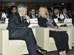 En el marco de la conmemoración de los 50 años de la OCDE, el Presidente de la República, Sebastián Piñera, sostuvo un encuentro con la secretaria de Estado de los Estados Unidos, Hillary Clinton. El Jefe de Estado participó hoy en París, Francia, en la conmemoración de los 50 años de la Organización para la Cooperación y el Desarrollo Económico, OCDE, ocasión en la que destacó los esfuerzos de su Gobierno por alcanzar el desarrollo antes de que termine esta década. • En la oportunidad, reiteró su llamado a la unidad de todos los chilenos para alcanzar este objetivo. “Esa meta debe convocarnos a todos. Por eso llamo a los chilenos a reconocer que vamos por buen camino y, al mismo tiempo, a unirnos para alcanzar las metas que todos juntos nos hemos fijado, que todos juntos vamos a lograr y que a todos nos van a beneficiar”, manifestó.