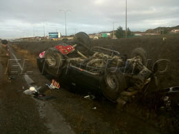 En Contacto con Radio Pingüino, el Jefe del Retén de Río Seco, suboficial mayor Francisco Sánchez, informó que Cerca de las 08:00 horas se produjo un volcamiento en el kilometro de 12 de la Ruta 9 Norte de un vehículo Isuzu dos puertas de color negro con tres personas al interior. Producto de esto resultaron lesionadas dos mujeres la conductora del móvil y una acompañante, siendo trasladas por personal del SAMU hasta el Hospital Clínico de Magallanes.