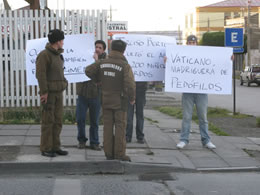 Una singular protesta debió enfrentar ayer en la mañana el secretario de Estado del Vaticano, Tarcisio Bertone. El hecho ocurrió a las 8.00 horas de ayer cuando se dirigía hacia el aeropuerto. Tres sujetos se plantaron a la salida de la residencia del obispo, ubicada en Balmaceda esquina 21 de Mayo con consignas alusivas a los abusos cometidos por sacerdotes. Ante esta situación, Carabineros debió solicitarles que se retiraran del lugar.